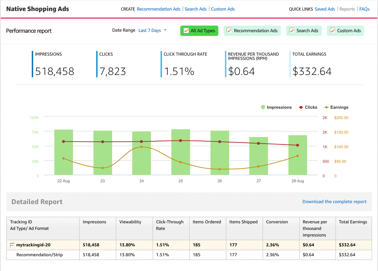 You can see the performance of the ad unit in the earnings report by link-type section on the Associates Central portal. The ad unit performance is classified under “Native Shopping Ads”. With the recently launched new version of reporting for Native Shopping Ads, a much more detailed and easy to use reporting is available in the US Associates Central. With the new reports, publishers using the ad unit can view performance metrics such as RPM (Revenue per thousand impressions) together with the detailed reports on the number of impressions, viewable impressions, clicks and conversions on a tracking ID level in these reports. You can also use these reports to view performance of different ad types and formats separately, and can also download for further analysis. The reports for the Strip format would be viewable in the line item with Ad Type/Ad Format as ‘Recommendation/Strip.’